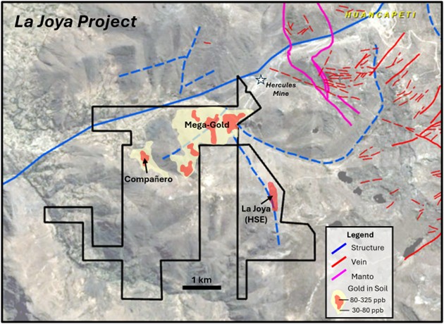 - the La Joya high-sulfidation epithermal (HSE) system, where minimal 2024 drilling confirmed high-grade silver mineralization including 1,005.0 gpt silver and 0.45 gpt gold over 0.75m within an alteration zone measuring 700m by 200m; and