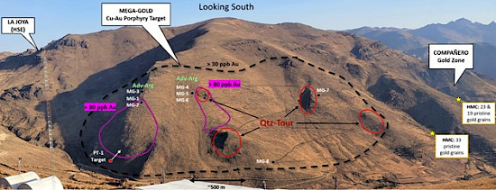 Figure 2 – Photo looking south showing the three principal target areas that make up the La Joya Project – 1) La Joya (HSE), 2) Mega-Gold intrusive center, and 3) Compañero gold breccia zone. Black dots show location of initial scout holes drilled at Mega-Gold in 2024. Red dot shows approximate location of drill pad to test the PT-1 target at Mega-Gold.