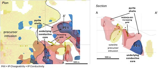 An initial “proof-of-concept” drilling program was completed in 2024 to test the idea that the Mega-Gold intrusive center is part of a mineralized porphyry system. A total of eight scout drill holes were completed across a broad area totaling 2,425.20m. These holes display a variety of vein types (principally B and D veins); elevated gold, copper and molybdenum; and hydrothermal alteration zoning consistent with a high-level porphyry environment (see news release dated August 29, 2024). All holes encountered pyrite-chalcopyrite-molybdenite mineralization hosted in veins. Higher temperature alteration minerals suggesting proximity to a porphyry are most strongly developed in the three eastern-most holes drilled in the Mega-Gold target area (see news release dated July 2, 2024). These holes also exhibit narrow zones of strong mineralization in MGDH24-002 with 2.0 m of 1.8 gpt gold and 0.35% copper from 89.0m depth, and 1.5m of 11.05 gpt gold from 127.5m depth in MGDH24-003, confirming a mineralized fluid source at depth. The strong IP chargeability zones are interpreted to be two separate pyrite shells related to underlying porphyry intrusions. Strongly conductive rock beneath the pyrite shells are potential zones of porphyry mineralization (PT-1, Figure 2 and 3) and warrant additional drilling.