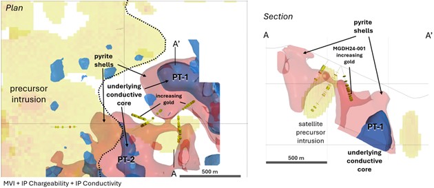 Figure 3 – Map showing high-priority discrete porphyry targets PT-1 and PT-2 with drill holes from 2024 drilling. Disc shapes on drill holes are >80 ppb gold. Section on right shows relation between induced polarization chargeability outlining pyrite shells (red) and underlying conductive features from the induced polarization resistivity model (blue).