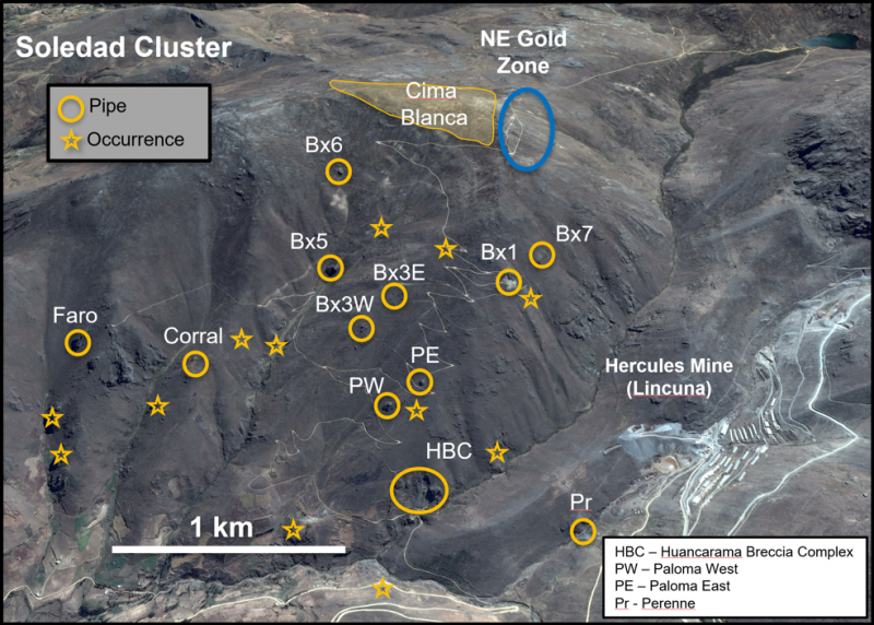 Figure 1 – View looking north showing breccia pipes and occurrences within the Soledad cluster.