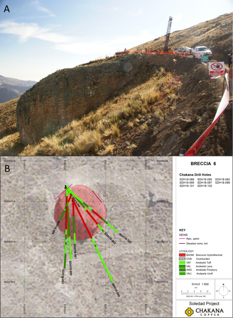 Vancouver, B.C., February 7, 2019 – Chakana Copper Corp. (TSX-V: PERU; OTC: CHKKF; FWB: 1ZX) (the “Company” or “Chakana”), is pleased to release initial drill results from Breccia Pipe 6 (Bx 6) at the Soledad copper-gold-silver project in central Peru. Bx 6 is located 500 metres north of Bx 5 and 1 km northwest of Bx 1 and is the northernmost and highest elevation outcropping breccia pipe identified to date in the Soledad cluster. There are seventeen confirmed breccia pipes on the Soledad project, twelve of which occur in the Soledad cluster, along with twelve other targets with distinctive alteration that is consistent with the alteration encountered adjacent to breccia pipes in previous drilling (Fig. 1). Four of the seventeen confirmed pipes have been drilled to date.
