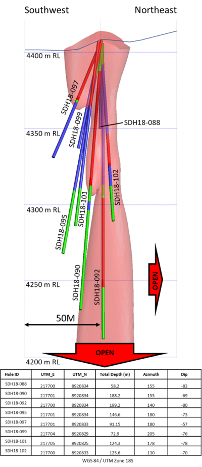 | SDH18-088 | 155 | -83 | No breccia intersected | 58.2m depth | |||||||