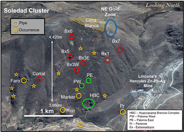 Figure 2 – View looking north at north-half of the project area showing drilled breccia pipes (red), untested targets (gold), and targets to be tested in the next drill program (Paloma East, Paloma West, Huancarama Breccia Complex). Additional targets on the south-half of the project not shown.